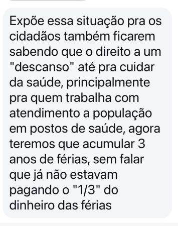 📢 “Estamos sendo obrigados a acumular férias. Isso afeta nossa saúde física e mental, principalmente para quem trabalha diretamente com atendimento à população”, relata um servidor.
