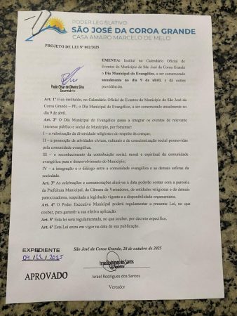 O vereador Rael de Del segue fortalecendo sua atuação em defesa dos valores cristãos e da liberdade religiosa no município. Foi aprovado pela Câmara de Vereadores o Projeto de Lei nº 002/2025, de sua autoria, que institui no Calendário Oficial de Eventos de São José da Coroa Grande o Dia Municipal do Evangélico, a ser comemorado anualmente no dia 9 de abril.